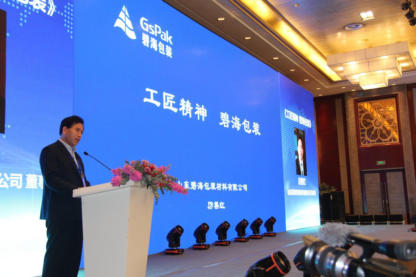山東碧海包裝材料有限公司董事長厲善紅在第七屆亞洲食品裝備論壇暨中國食品和包裝機械工業(yè)協(xié)會第二十七屆年會上做題為《工匠精神 碧海包裝》的發(fā)言