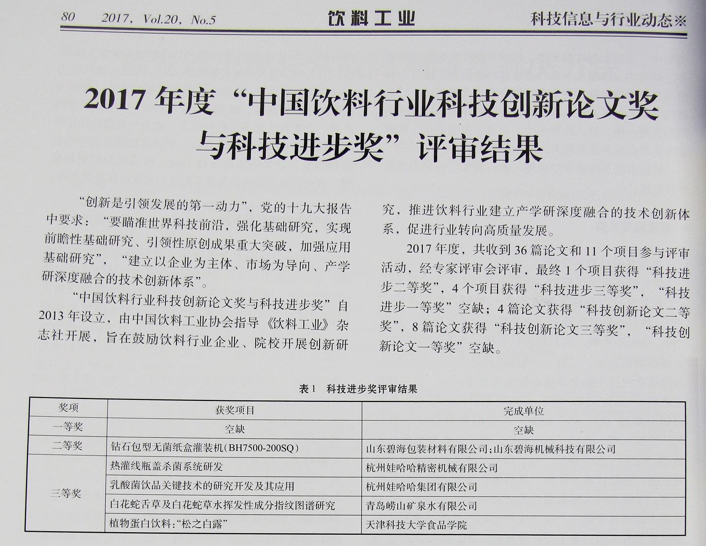 2017年11月21-24日,中國(guó)飲料工業(yè)協(xié)會(huì)年會(huì)、第八屆中國(guó)國(guó)際飲料工業(yè)科技展、“2017中國(guó)飲料行業(yè)科技創(chuàng)新論文獎(jiǎng)與科技進(jìn)步獎(jiǎng)”頒獎(jiǎng)活動(dòng)在上海新國(guó)際博覽中心同期舉行,經(jīng)中國(guó)飲料工業(yè)協(xié)會(huì)評(píng)定,我公司的《鉆石包型無(wú)菌紙盒灌裝機(jī)(BH7500-200SQ)》項(xiàng)目榮獲“中國(guó)飲料行業(yè)科技進(jìn)步獎(jiǎng)”二等獎(jiǎng)。