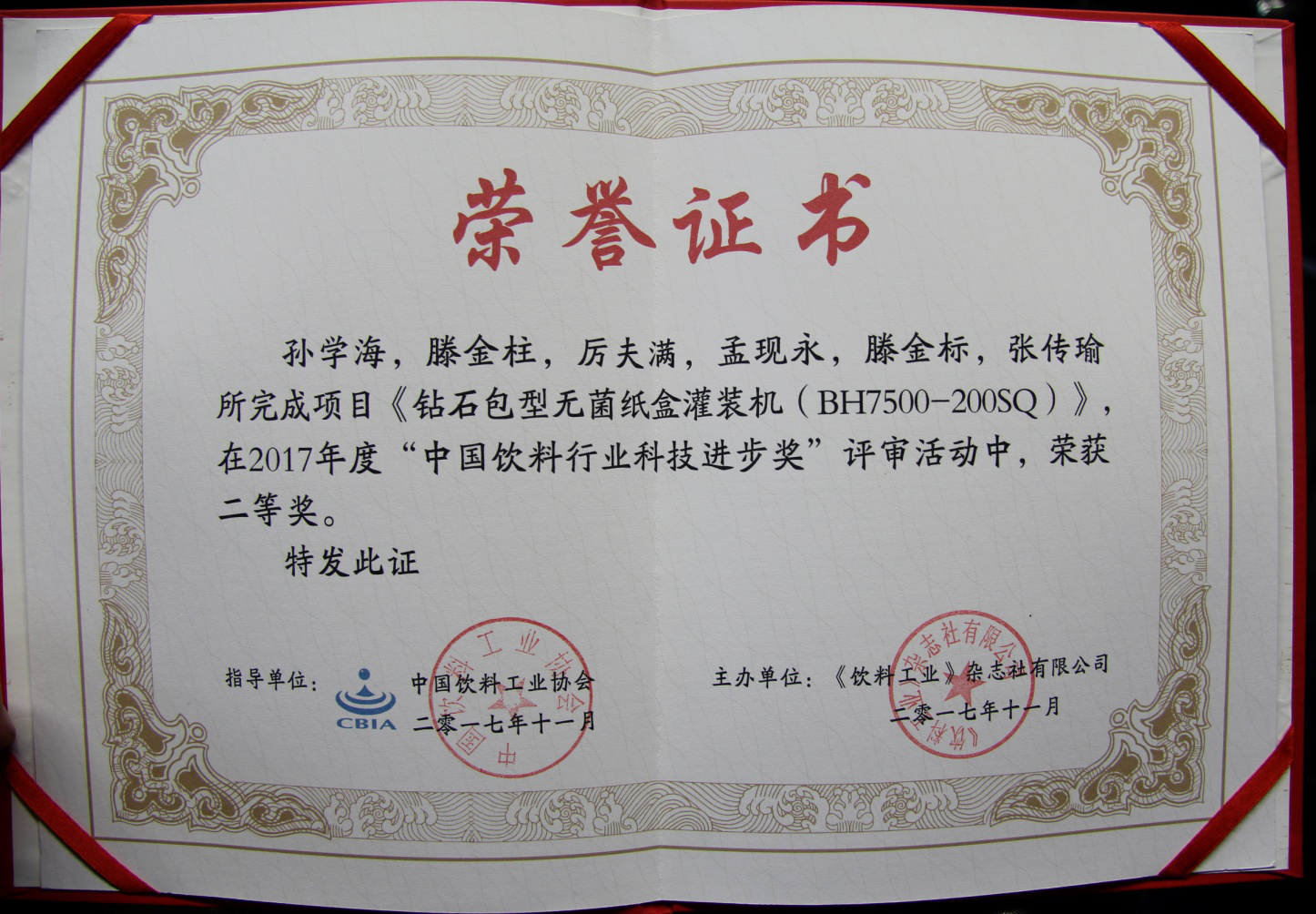 2017年11月21-24日,中國(guó)飲料工業(yè)協(xié)會(huì)年會(huì)、第八屆中國(guó)國(guó)際飲料工業(yè)科技展、“2017中國(guó)飲料行業(yè)科技創(chuàng)新論文獎(jiǎng)與科技進(jìn)步獎(jiǎng)”頒獎(jiǎng)活動(dòng)在上海新國(guó)際博覽中心同期舉行,經(jīng)中國(guó)飲料工業(yè)協(xié)會(huì)評(píng)定,我公司的《鉆石包型無(wú)菌紙盒灌裝機(jī)(BH7500-200SQ)》項(xiàng)目榮獲“中國(guó)飲料行業(yè)科技進(jìn)步獎(jiǎng)”二等獎(jiǎng)。